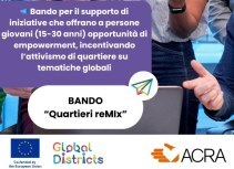 ACRA lancia il "BANDO QUARTIERI reMIx" rivolto ad associazioni e gruppi giovanili. Bando per il supporto di iniziative che offrono a persone giovani (15-30 anni) opportunità di empowerment, incentivando l’attivismo di...